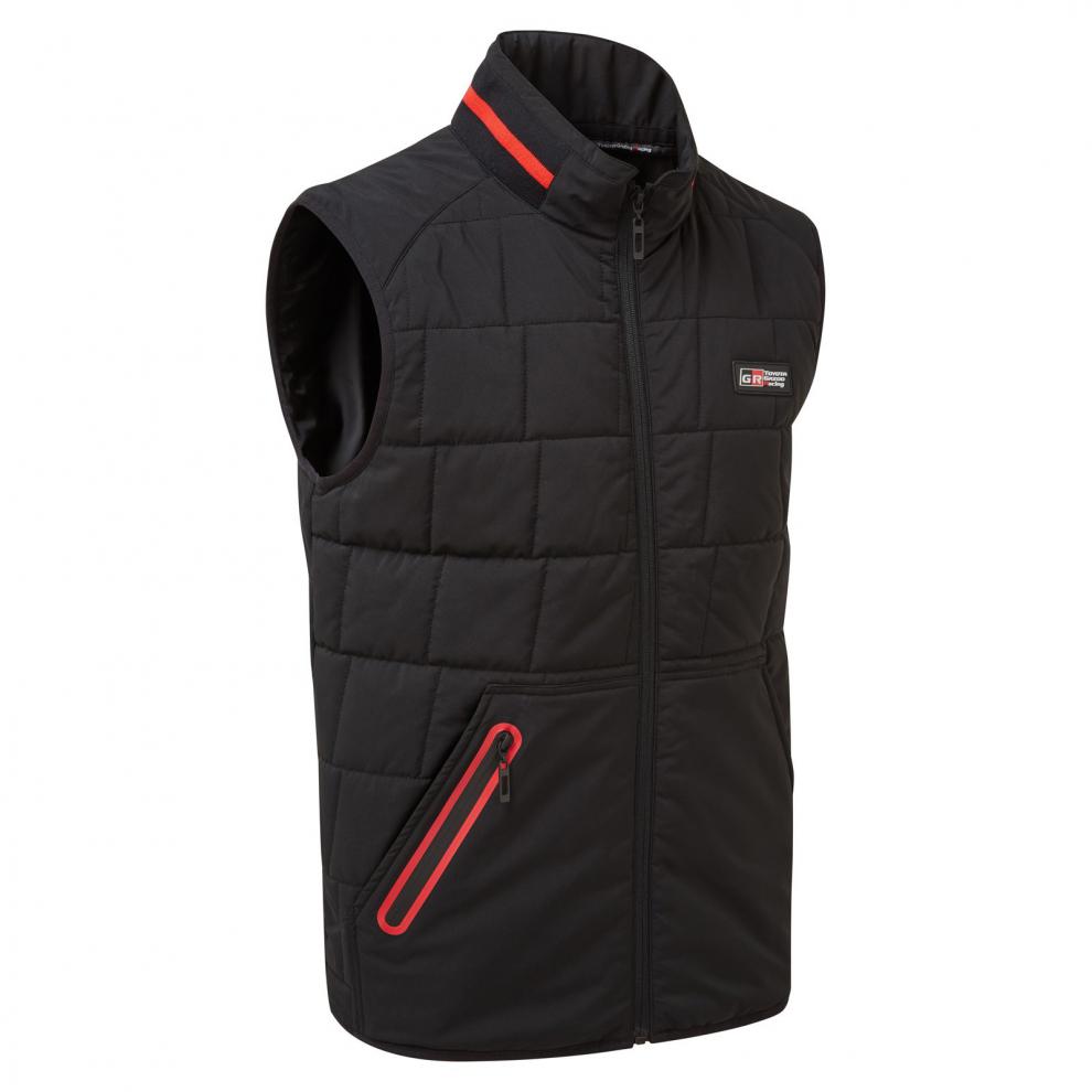 Chaleco deportivo ligero y atractivo con un exclusivo diseño basado en el logotipo de TGR, perfecto para usar como capa de abrigo o bajo una chaqueta ligera. Logotipo de TOYOTA GAZOO Racing en la parte frontal, dos bolsillos delanteros, bolsillo con cremallera y detalle rojo en el cuello. Un complemento perfecto para cualquier uniforme o para usarlo en actividades promocionales dirigidas a clientes.